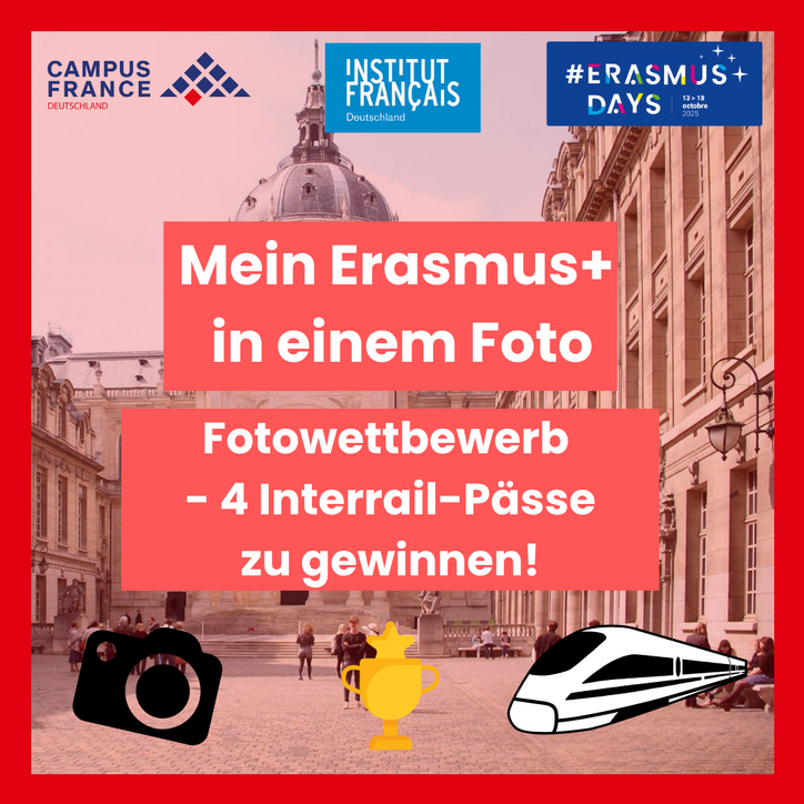 Du hast eine Erasmus+ Mobilität in Frankreich gemacht oder du machst sie gerade? Du bist nach dem 1. April 1998 geboren? Du hast Lust Interrail-Pässe zu gewinnen! Wir warten auf deine beste Erasmus +-Foto!